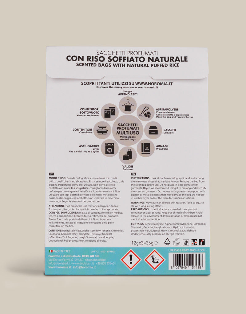 Creati con riso soffiato naturale non alimentare, i sacchetti profumati Horomia sono formulati per donare ai tuoi capi e alla tua casa il profumo unico e inconfondibile della tua fragranza preferita. Ogni confezione contiene tre sacchetti profumati avvolti in una busta trasparente ad alta protezione, per un profumo intenso e duraturo fino a 12 settimane.