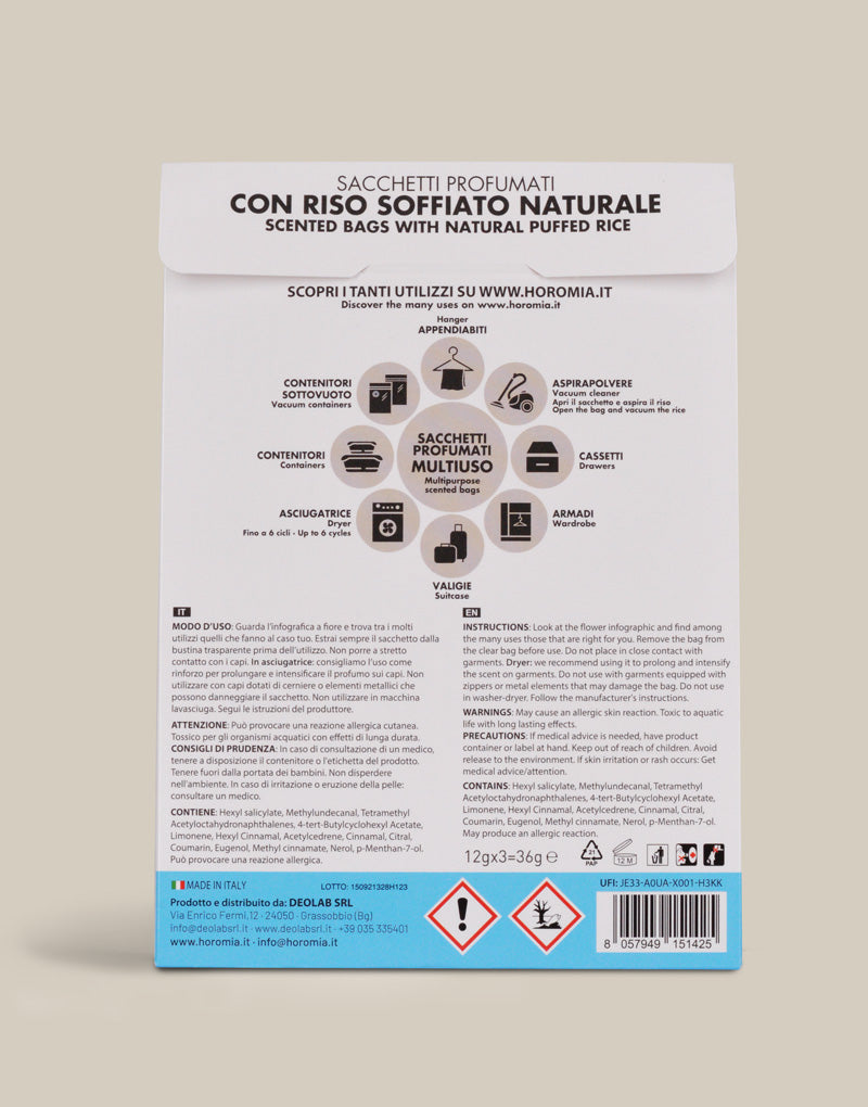 Creati con riso soffiato naturale non alimentare, i sacchetti profumati Horomia sono formulati per donare ai tuoi capi e alla tua casa il profumo unico e inconfondibile della tua fragranza preferita. Ogni confezione contiene tre sacchetti profumati avvolti in una busta trasparente ad alta protezione, per un profumo intenso e duraturo fino a 12 settimane.