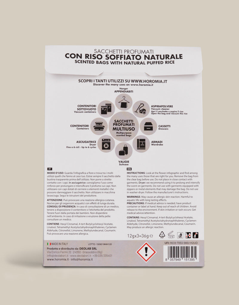 Creati con riso soffiato naturale non alimentare, i sacchetti profumati Horomia sono formulati per donare ai tuoi capi e alla tua casa il profumo unico e inconfondibile della tua fragranza preferita. Ogni confezione contiene tre sacchetti profumati avvolti in una busta trasparente ad alta protezione, per un profumo intenso e duraturo fino a 12 settimane.