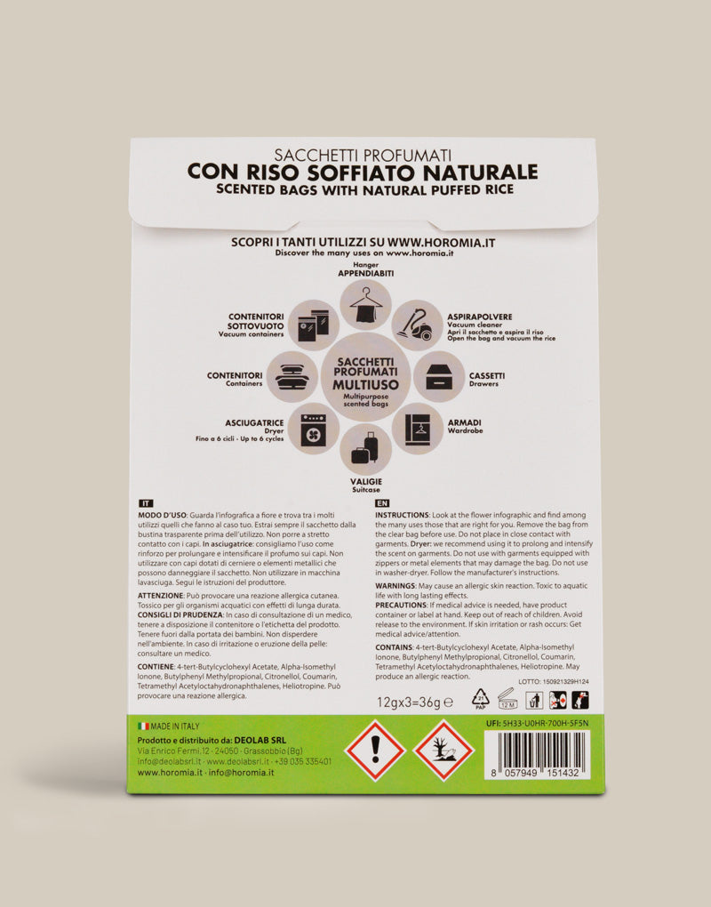 Creati con riso soffiato naturale non alimentare, i sacchetti profumati Horomia sono formulati per donare ai tuoi capi e alla tua casa il profumo unico e inconfondibile della tua fragranza preferita. Ogni confezione contiene tre sacchetti profumati avvolti in una busta trasparente ad alta protezione, per un profumo intenso e duraturo fino a 12 settimane.