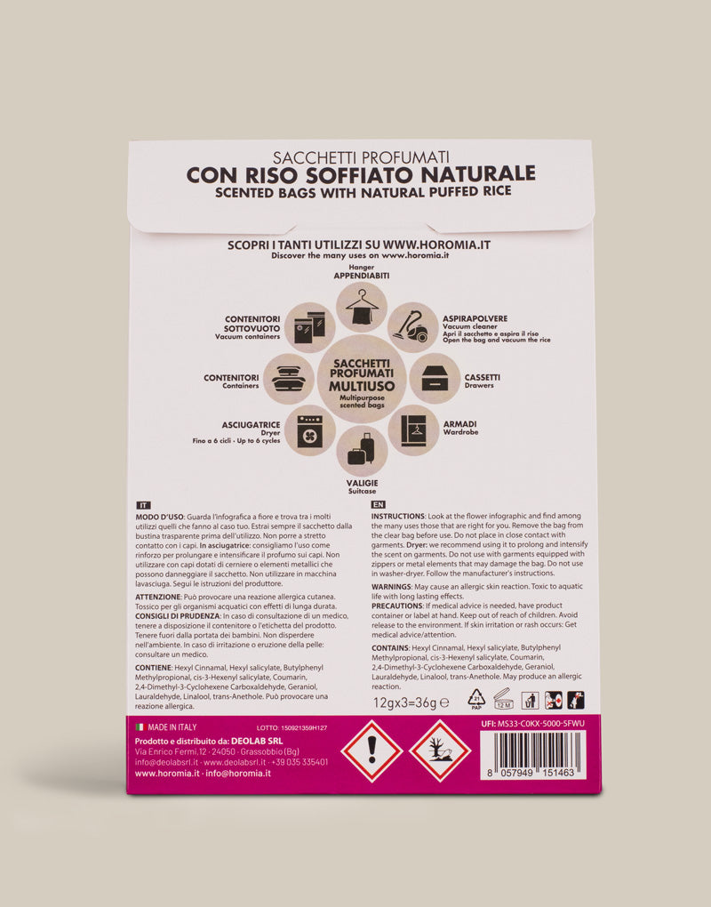Creati con riso soffiato naturale non alimentare, i sacchetti profumati Horomia sono formulati per donare ai tuoi capi e alla tua casa il profumo unico e inconfondibile della tua fragranza preferita. Ogni confezione contiene tre sacchetti profumati avvolti in una busta trasparente ad alta protezione, per un profumo intenso e duraturo fino a 12 settimane.